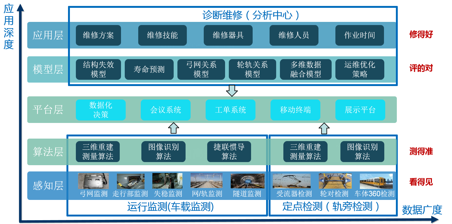 公司基于“軌道交通運營安全保障數(shù)據(jù)平臺”,依托自主研發(fā)的一系列智能檢測、監(jiān)測、維修裝備及專業(yè)的維保團隊,形成了一套“昆山高新軌道交通智能維保體系”,體系貫穿軌道交通智能維保的各個環(huán)節(jié)。